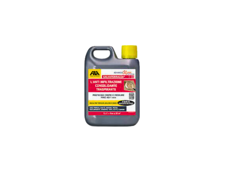 Salvaterrazza è un impregnante idrorepellente a base solvente con tecnologia fluorurata, sviluppato per la protezione duratura di superfici esterne esposte ad agenti atmosferici. La sua formulazione penetra in profondità senza creare pellicole superficiali, mantenendo la traspirabilità del materiale. Particolarmente indicato per terrazzi, balconi e pavimentazioni in pietra naturale, laterizi e calcestruzzo. Resistenza certificata a gelo, salsedine e inquinamento urbano.